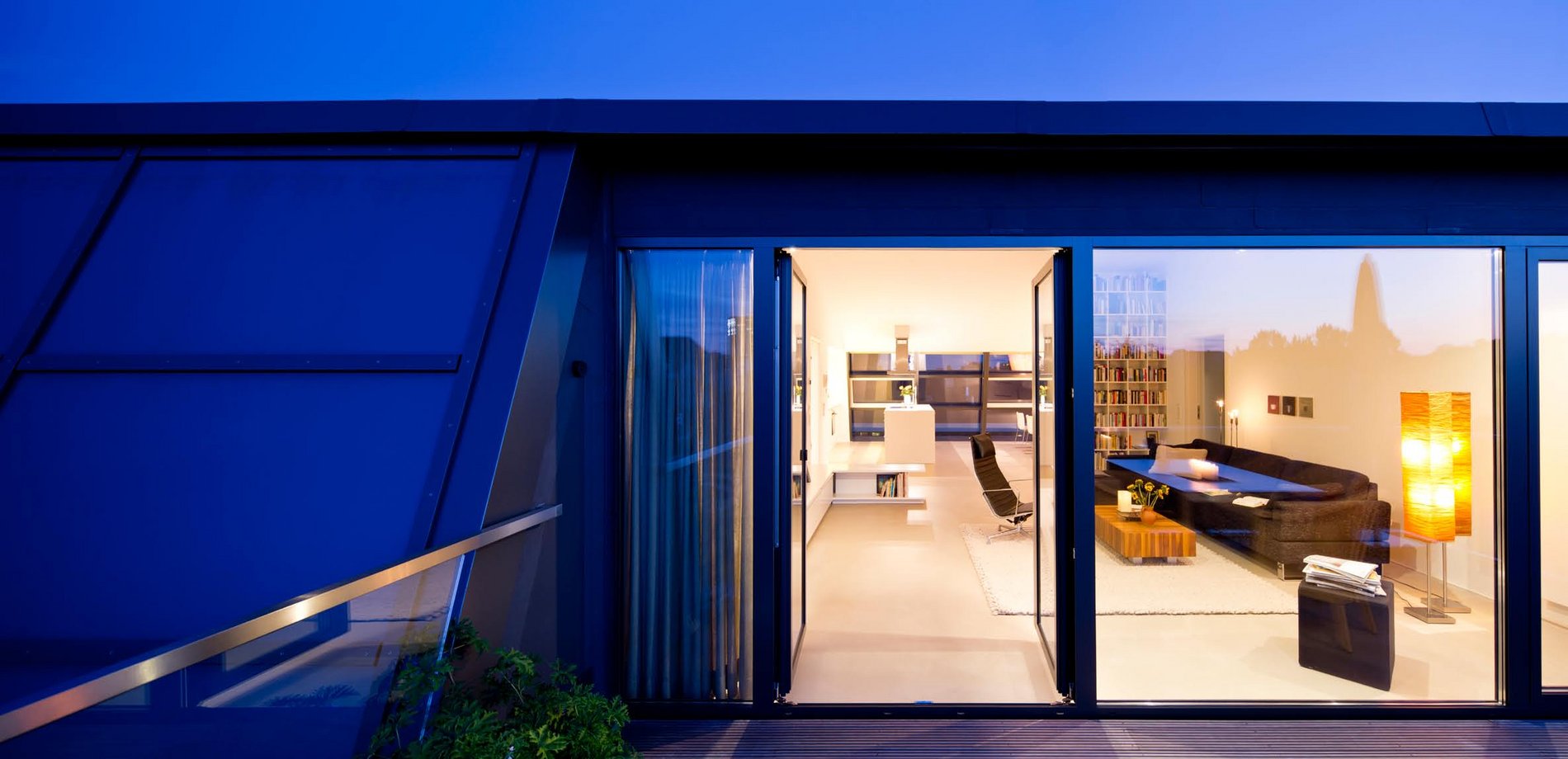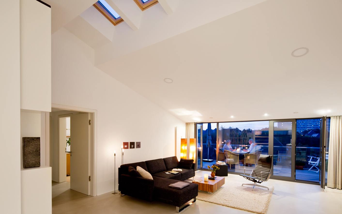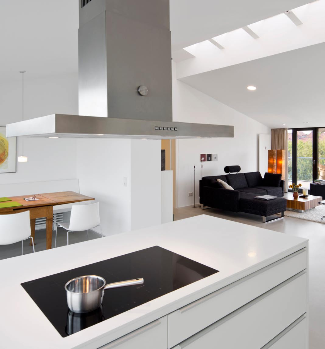 Die Dachkonstruktion wurde zimmermannstechnisch komplett erneuert. Im Dach entstand ein neues, modernes Loft. Drei kleine individuelle Rückzugsräume an den Gebäudeecken kontrastieren mit dem zentralen, großen und großzügig verglasten Wohnraum.