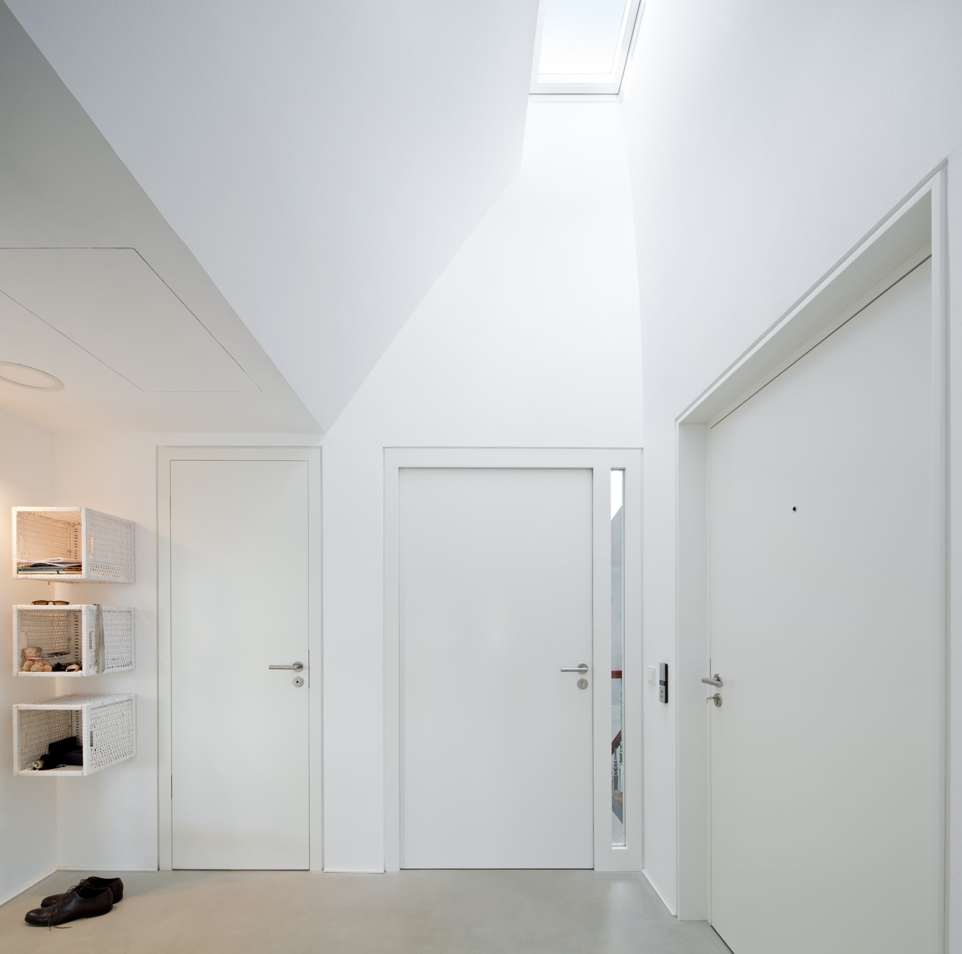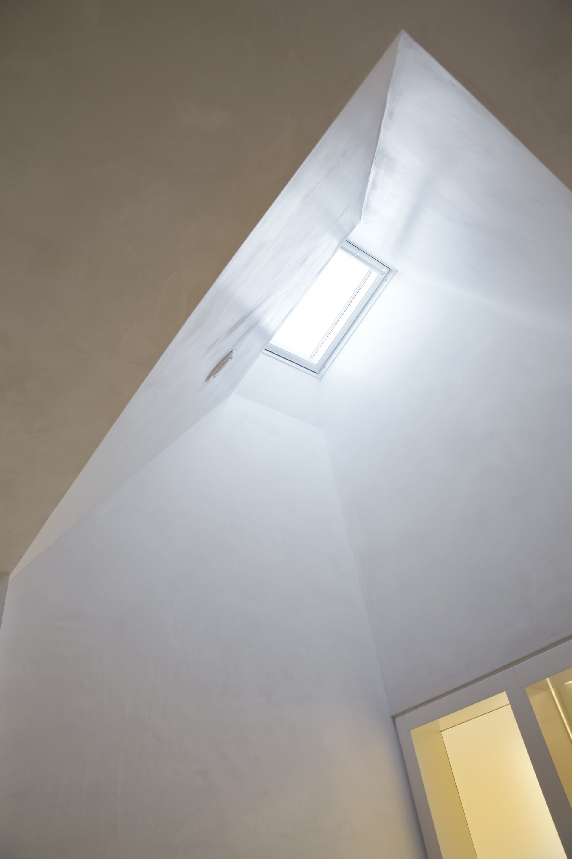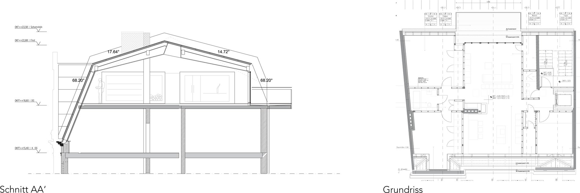 Die Dachkonstruktion wurde zimmermannstechnisch komplett erneuert. Im Dach entstand ein neues, modernes Loft. Drei kleine individuelle Rückzugsräume an den Gebäudeecken kontrastieren mit dem zentralen, großen und großzügig verglasten Wohnraum.