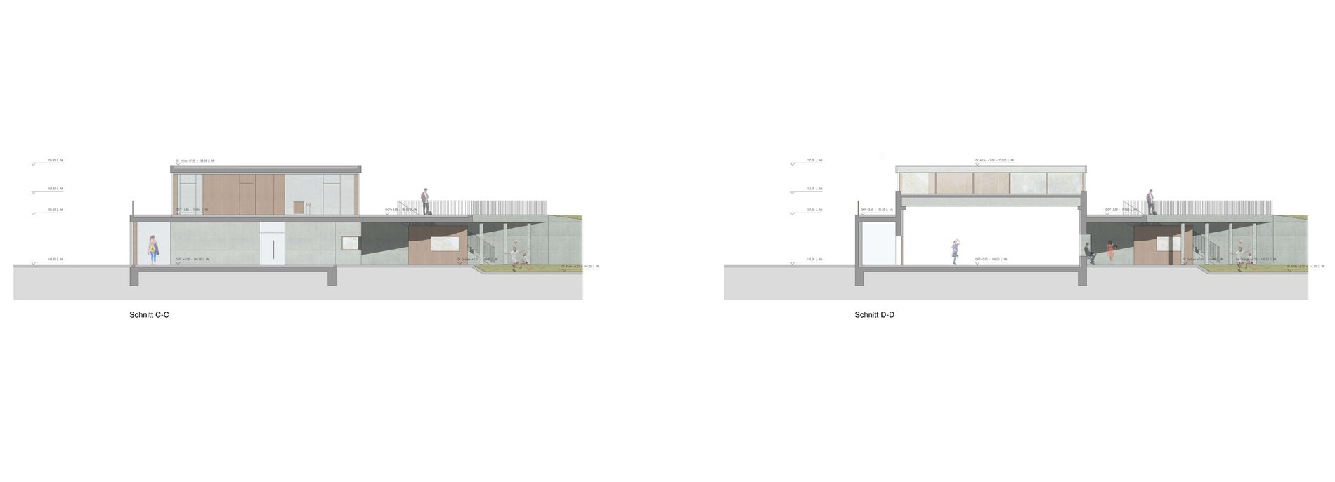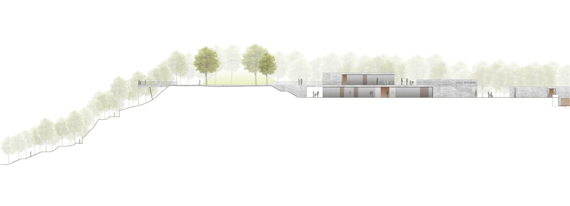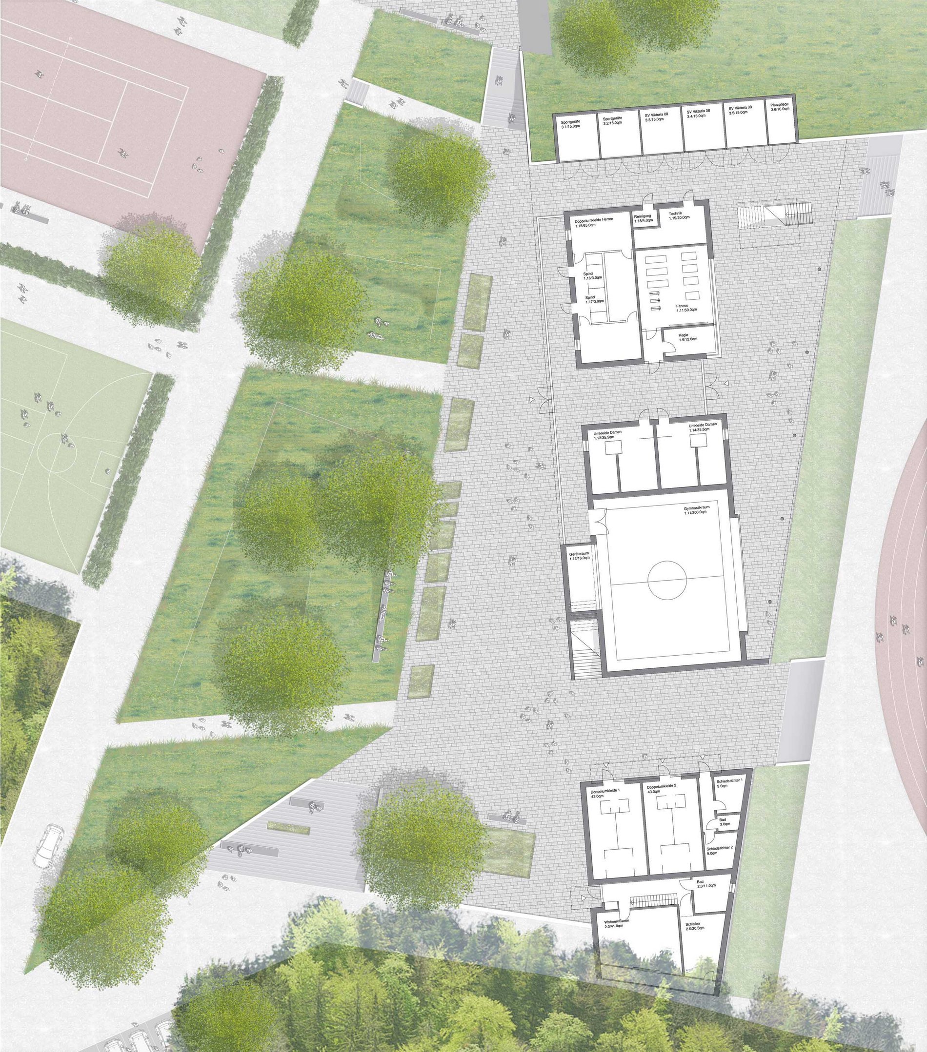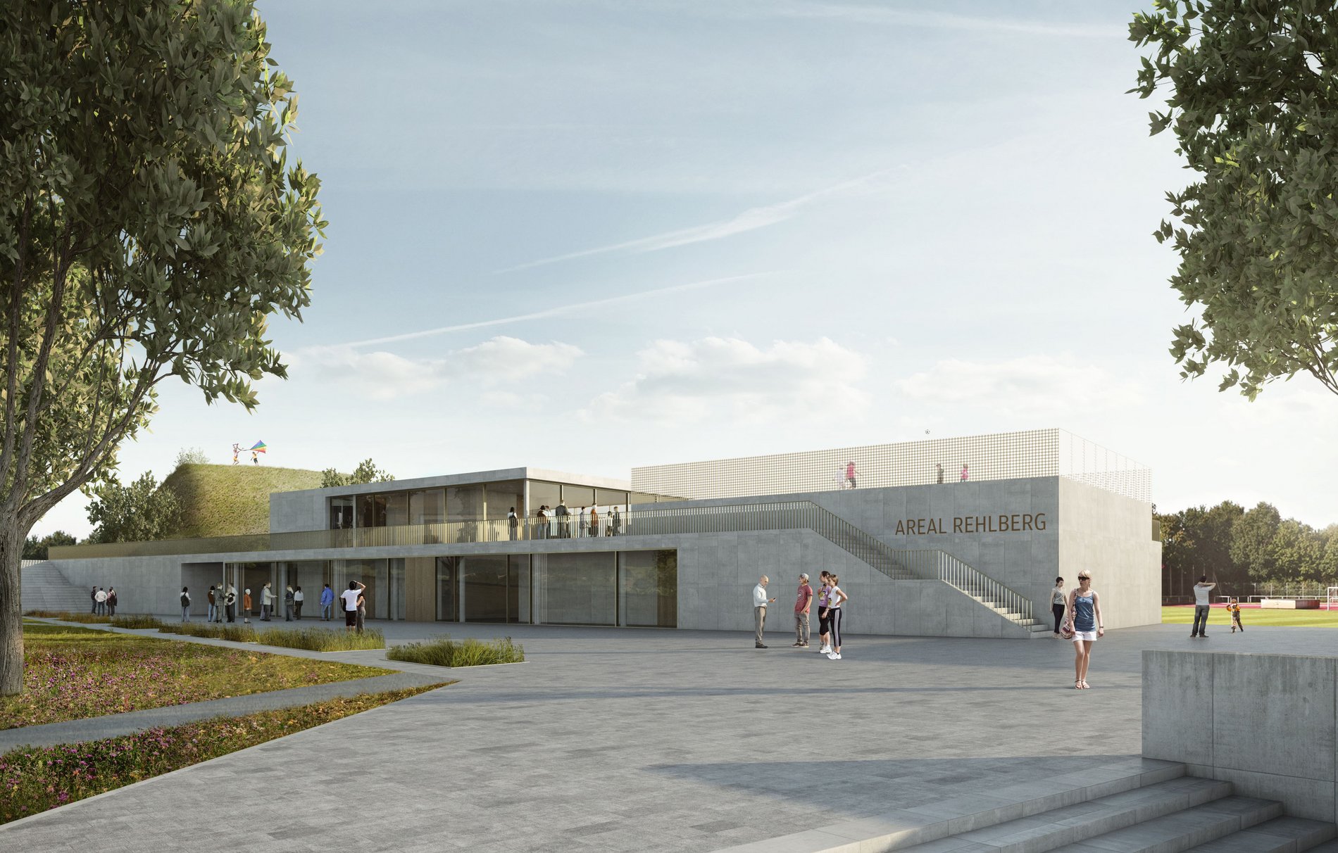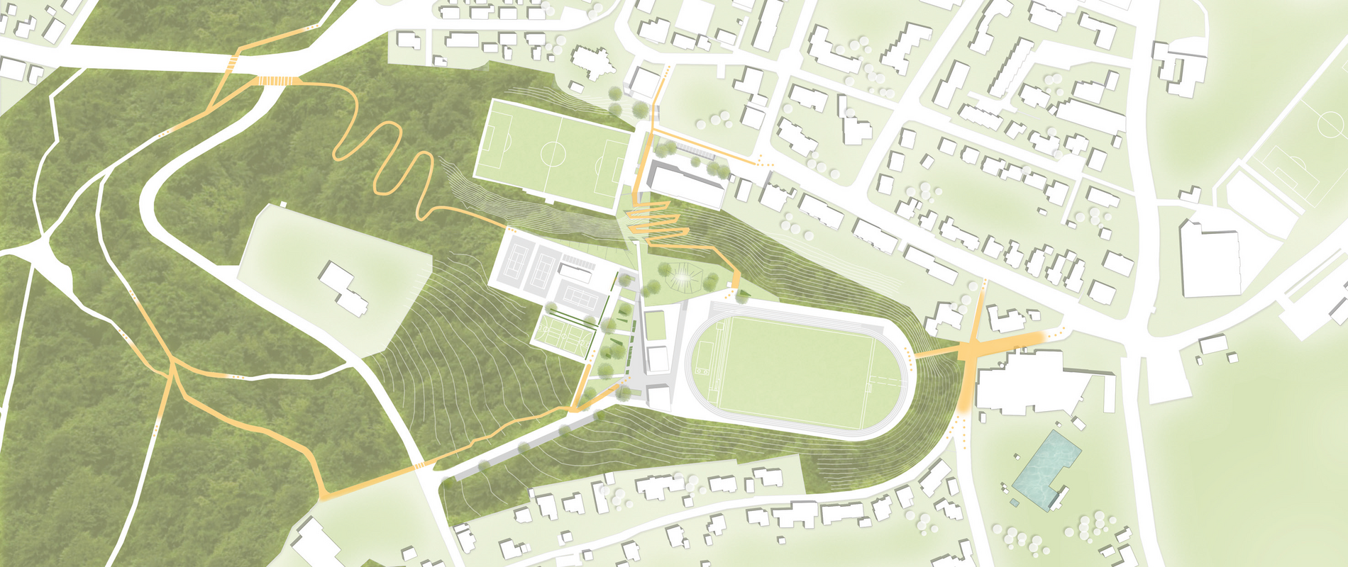 Zum Gesamtkonzept gehört auch die Erneuerung des bestehenden stark sanierungsbedürftigen, überdimensionierten Sportheims. Im Gegensatz zu diesem wurde bei dem geplanten Neubau die vorhandene Topografie miteinbezogen, so dass neue und bestehende Wegebeziehungen über die Aussichtsterrassen des Gebäudes oder darunter hindurch führen.