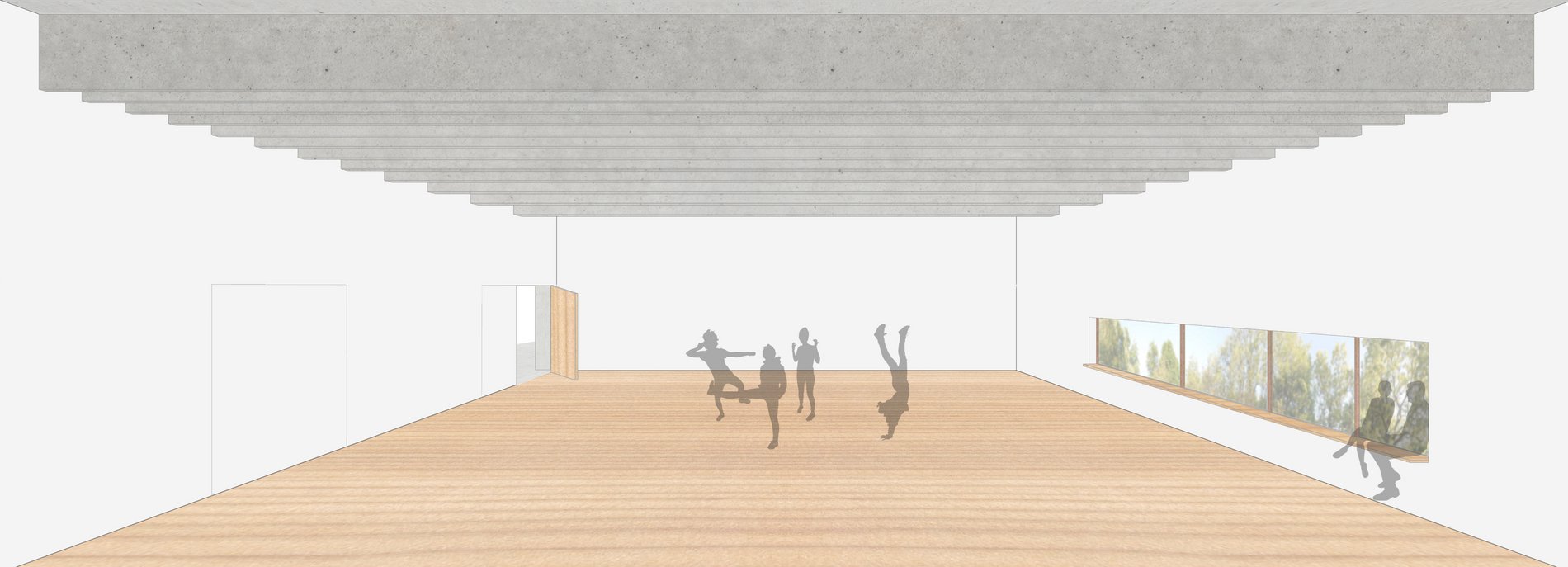 Wenige Materialien wie Beton, Glas, Holz und Stahl unterstreichen eine zurückhaltende, elegante Architektursprache, die sich einem öffentlichen Sportgebäude angemessen präsentiert.