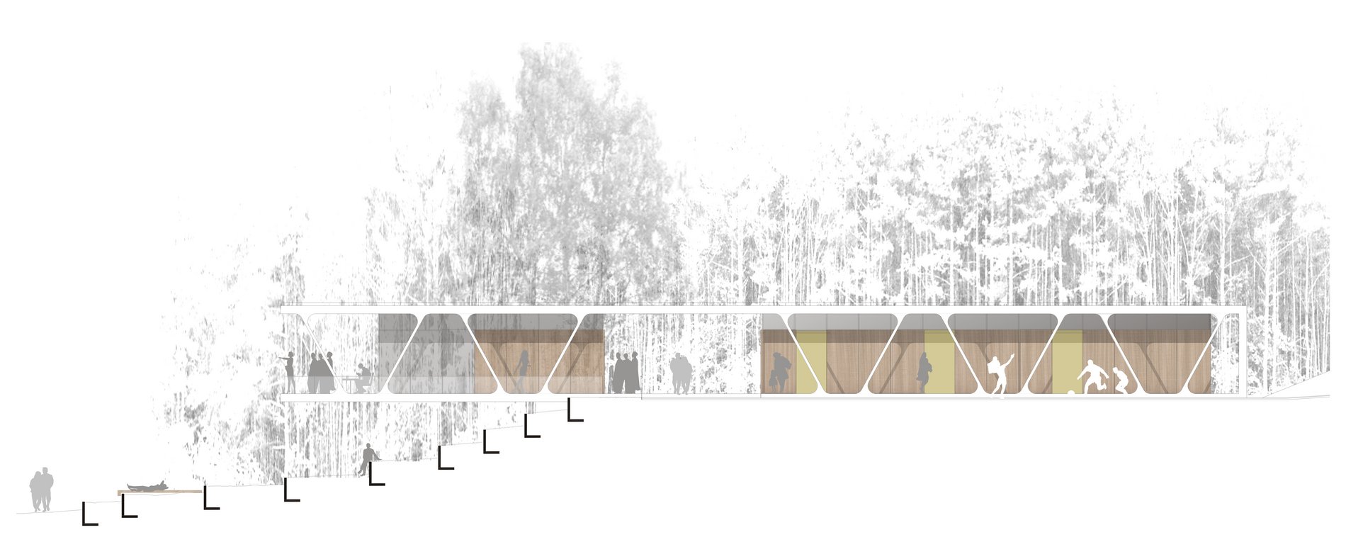 Im Inneren sind die Baukörper, kontrastierend zur äußeren Erscheinung, farbig gestaltet. Bei geschlossenen Fassaden ist das Gebäude im Winter als ruhende Skulptur im Landschaftsraum wahrnehmbar.