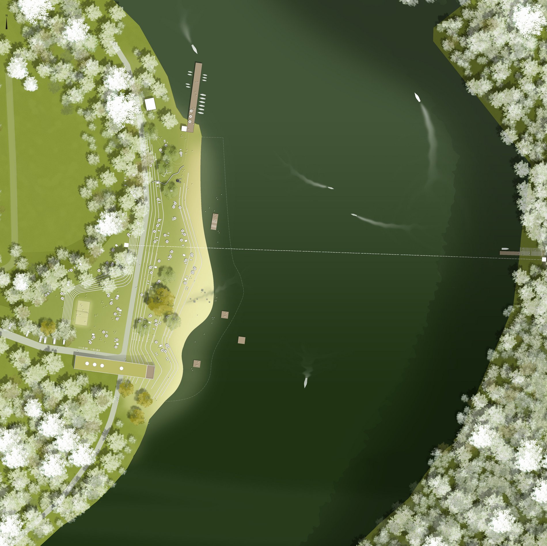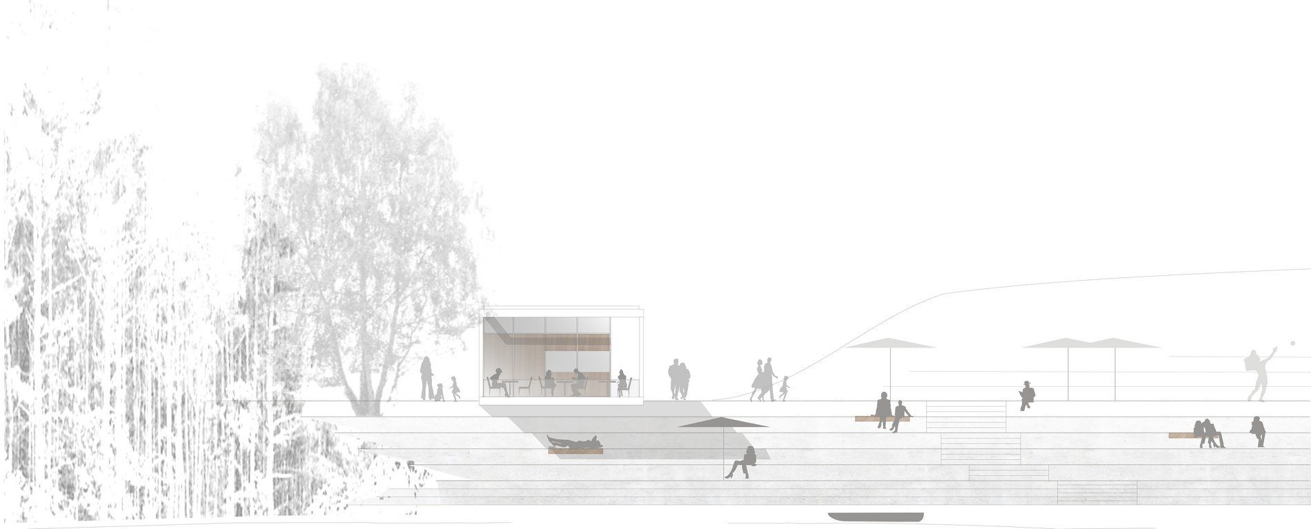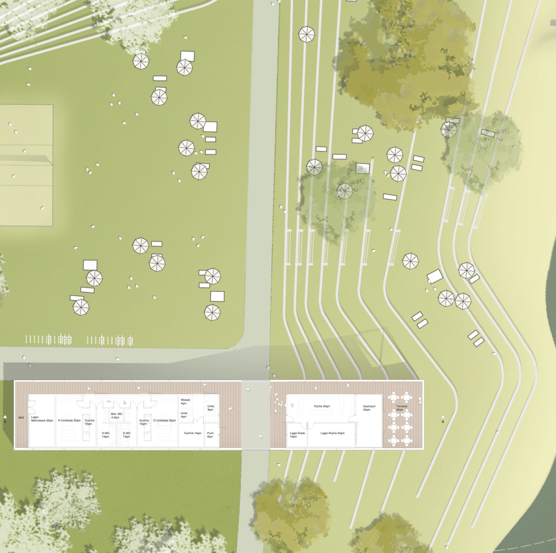 Die Durchfahrt stellt zugleich eine Funktionstrennung innerhalb des Raumprogramms da. Zum See sind Außenterrasse und Gastronomie angeordnet, Umkleidebereiche und Nebenräume befinden sich auf der See, abgewandten Seite. Die eingestellten Holzkuben werden mittels Schiebetüren komplett und sicher verschlossen.
