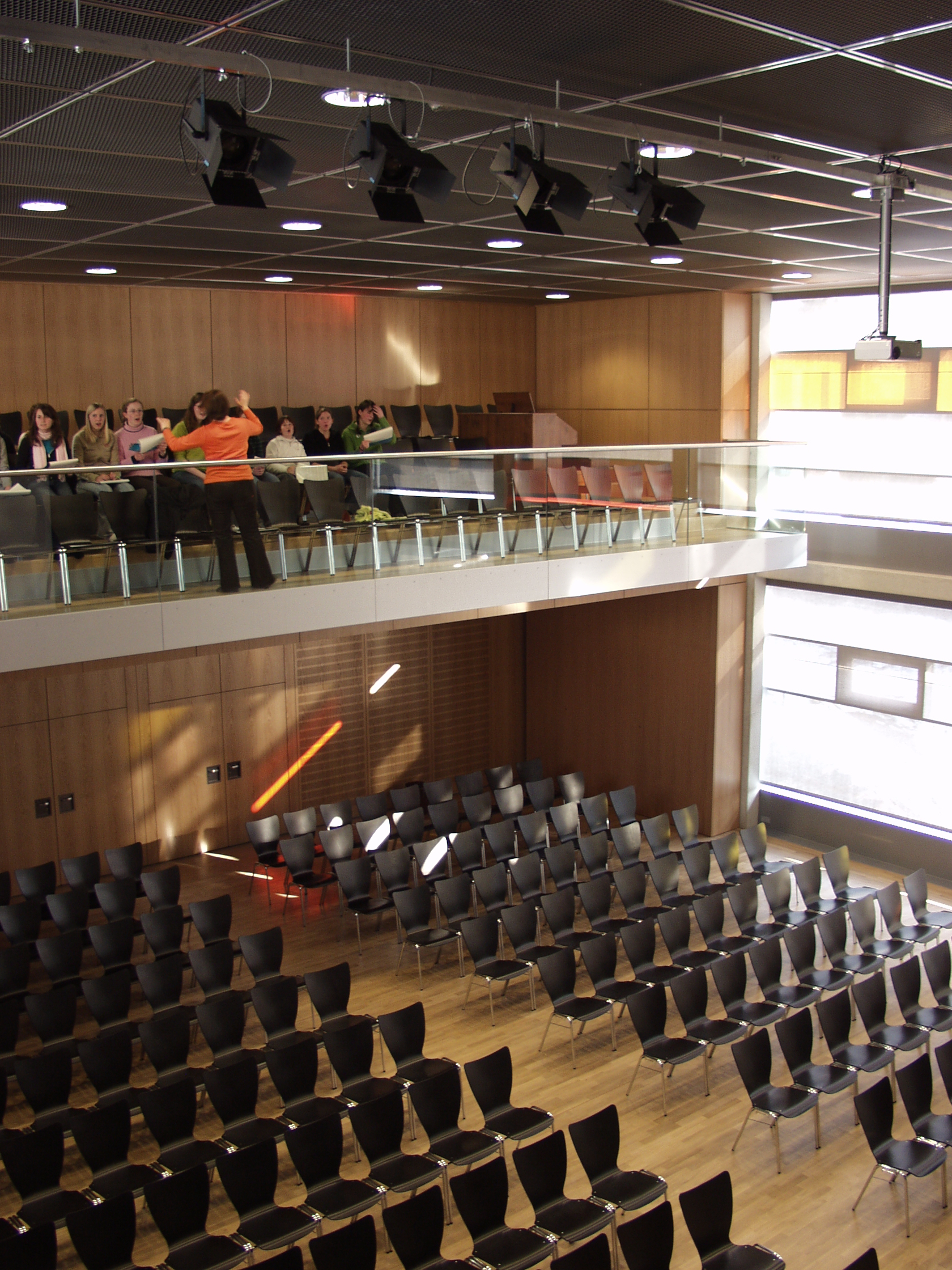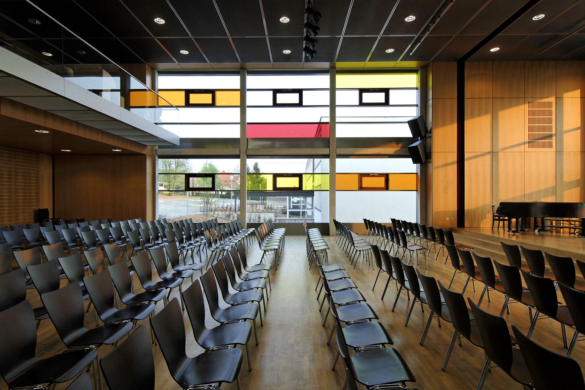 Zusätzliche oberhalb der Streckmetall-decke genau berechnete Absorber und Reflektoren, mit teilweise geneigter Ausrichtung, erzeugen optimale akustische Bedingungen in der Aula. Der auskragende Neubau mit einer raum-hohen, zur Stadt hin ausgerichteten Glasfassade, verleiht dem Gebäudeensemble ein neues von weitem sichtbares Erscheinungsbild.