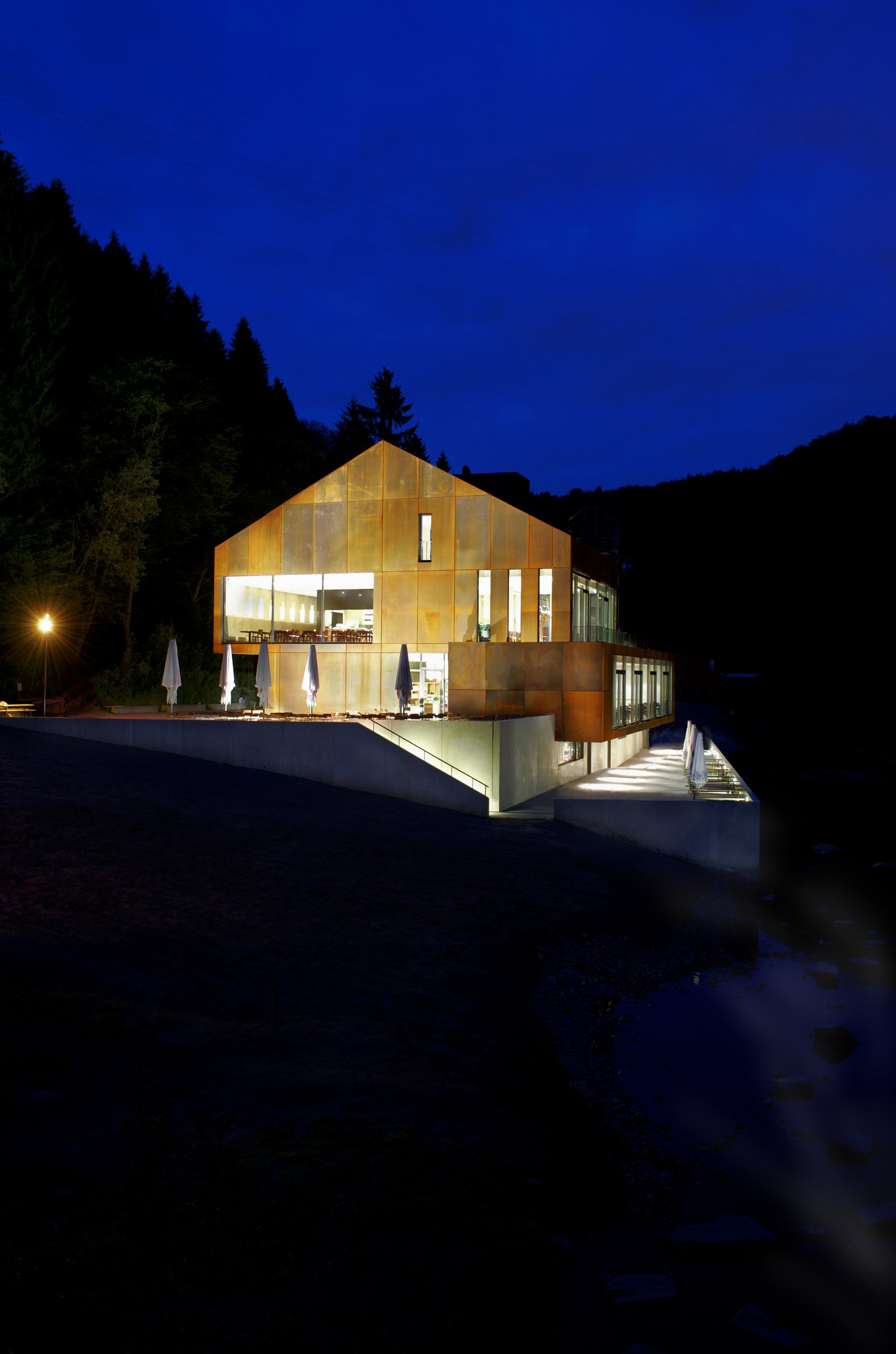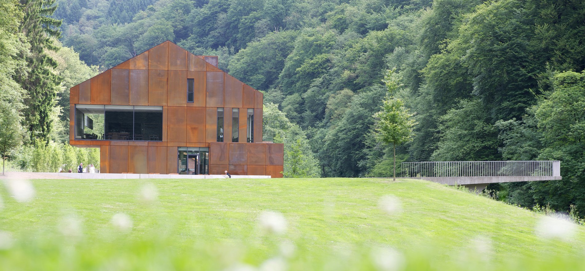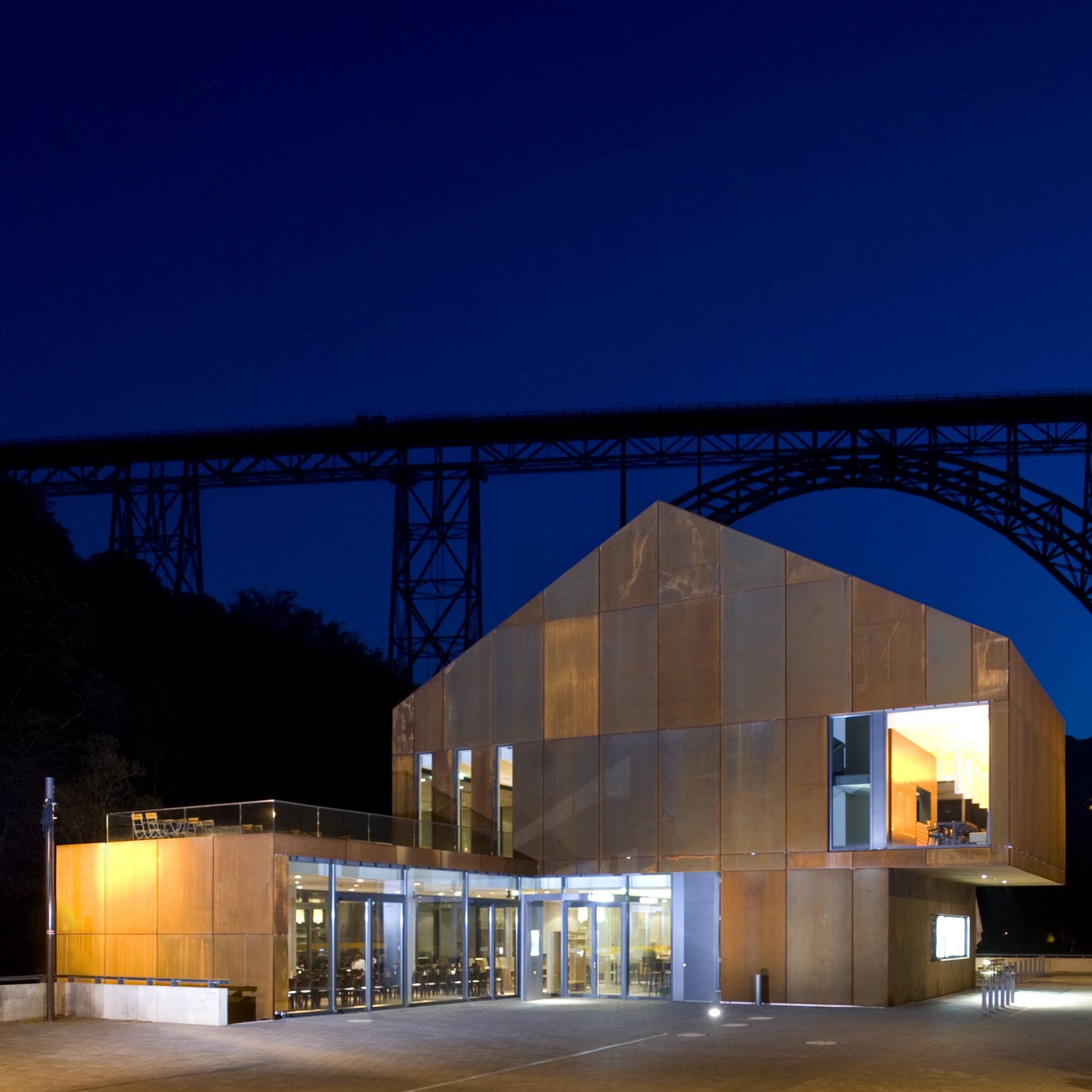 Das zweigeschossige Gebäude besteht aus einer homogenen Fassade aus wetterfestem Baustahl, dessen rostrote Oberfläche sich sensibel in die natürlichen Farben der Landschaft einfügt und einen inhaltlichen Bezug zur filigranen Stahlkonstruktion des Brückenbogens schlägt.