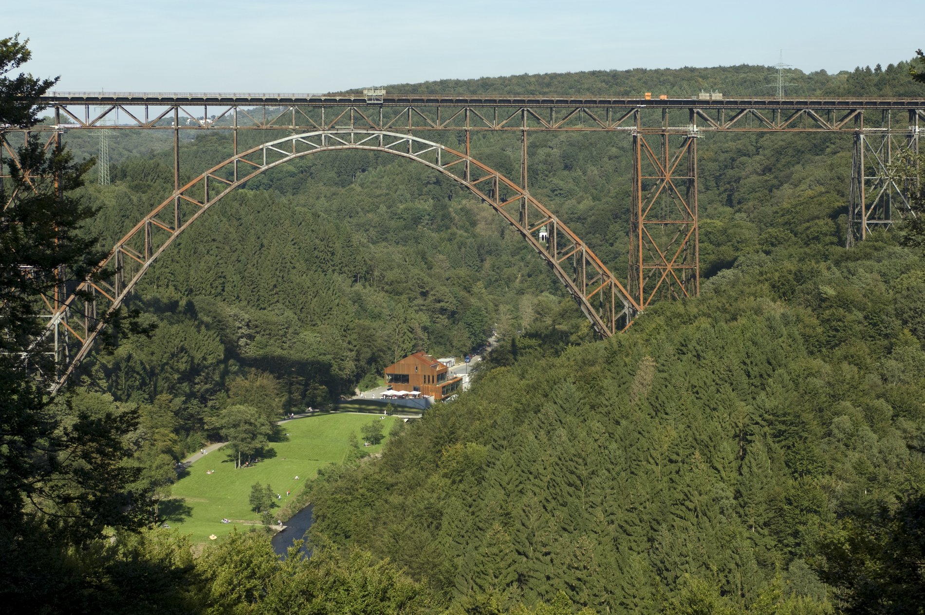 Der 2006 zur Regionale umgestaltete Brückenpark, bildet eine beindruckende landschaftliche Kulisse umgeben von bewaldeten Berghängen und dem Flusslauf der Wupper.