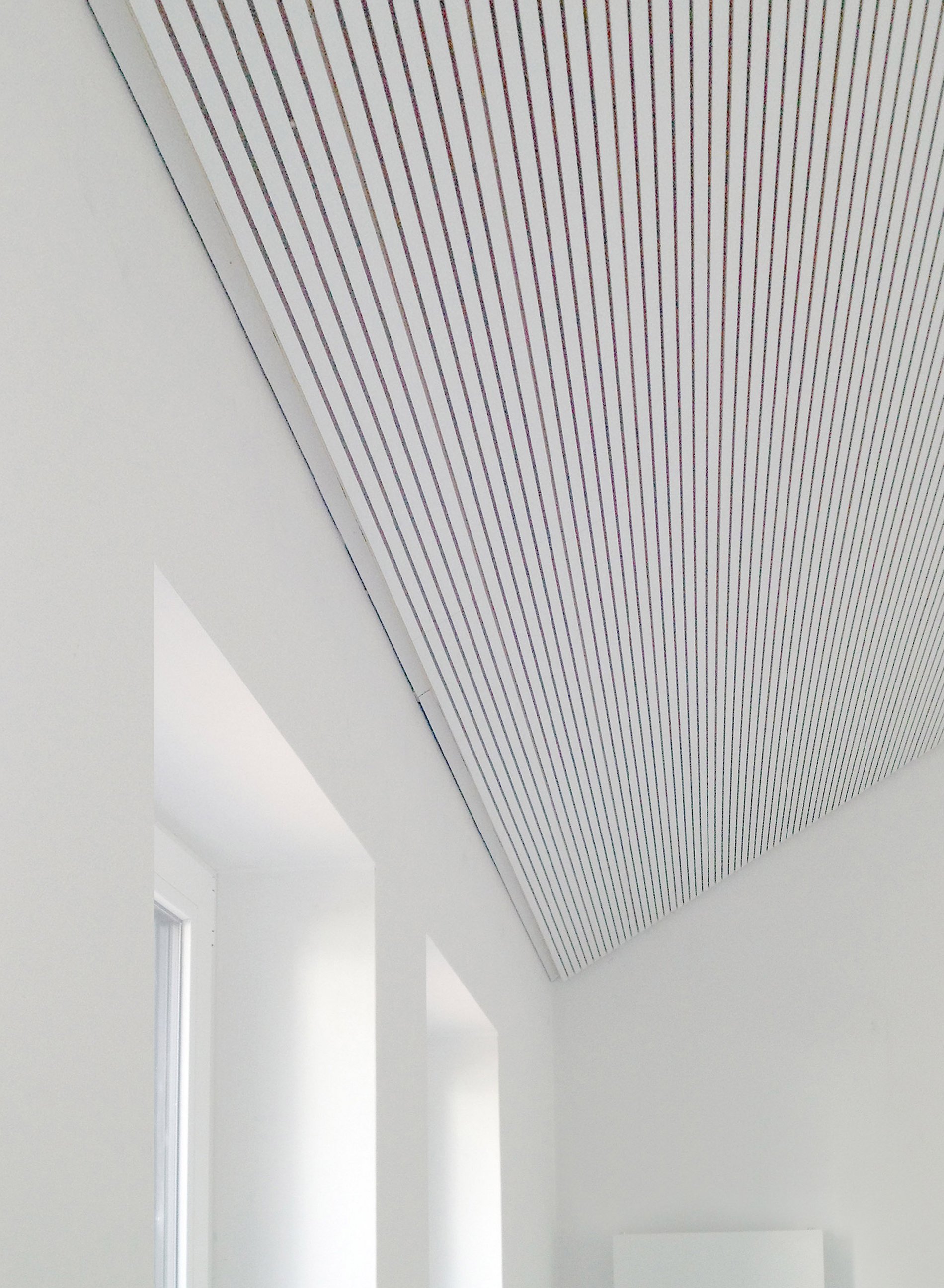 Die Holzlamellendecke im Innenraum sorgt für die erforderliche Raumakustik.
